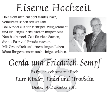 14.12.2011 um 17:46 Uhr von DavidblataFriedrich und Gerda Sempf feiern Eiserne Hochzeit – Nachbarn