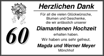 Dazu trug wohl auch der 2. Weihnachtstag 1950 bei: Das junge Ehepaar war damals bei ihren Eltern in Havekost, als die Nachricht kam, dass der Hof seiner Eltern in Mönchhof völlig niedergebrannt war. Dadurch, so erinnern sich die Eheleute, hätten sie bei Null anfangen müssen, als sie den Hof im Mai Werner und Magda Meyer feiern „Diamantene“ – „Nie langweilig".